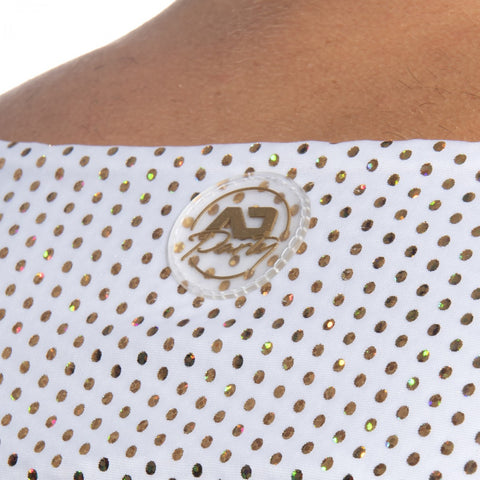 Exquisite party-style Body Harness that shines from a thousand different angles, thanks to the multitude of reflective golden spots all-over.