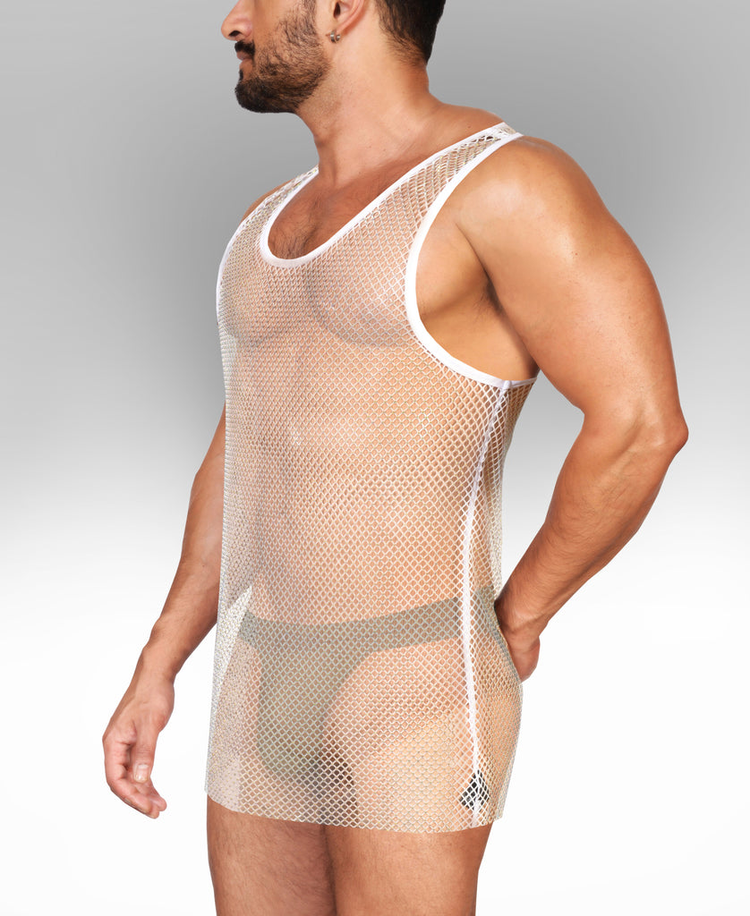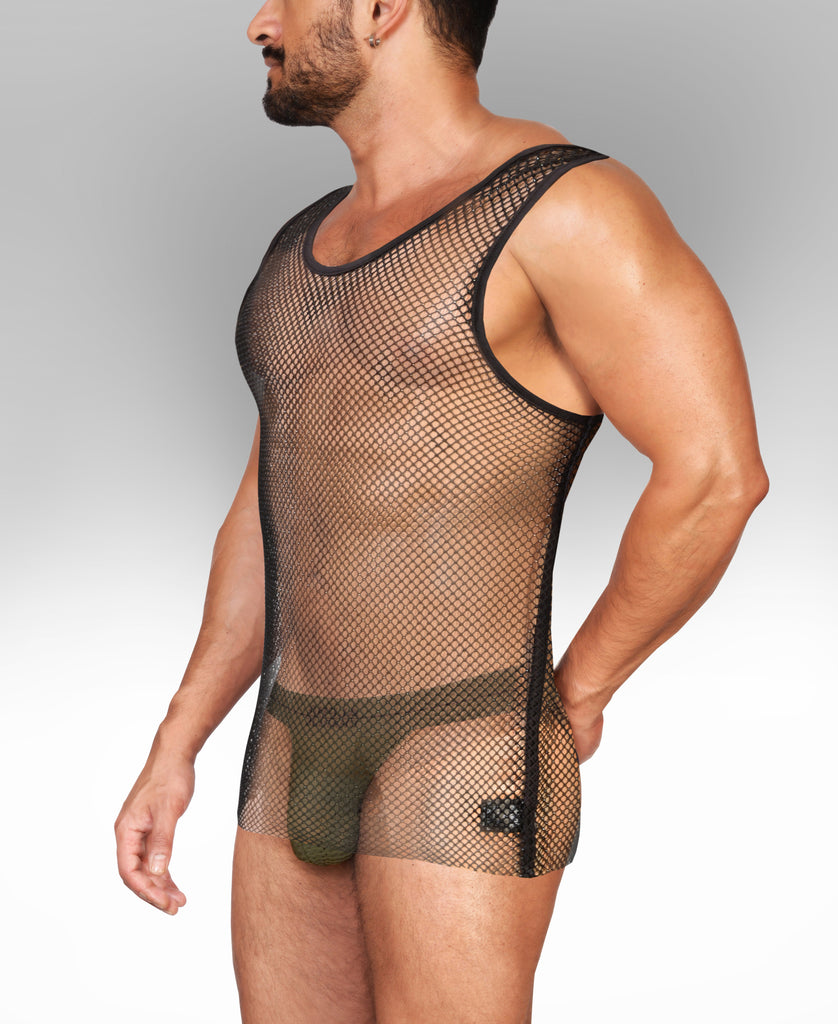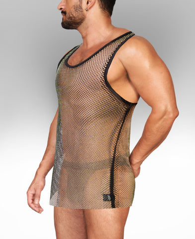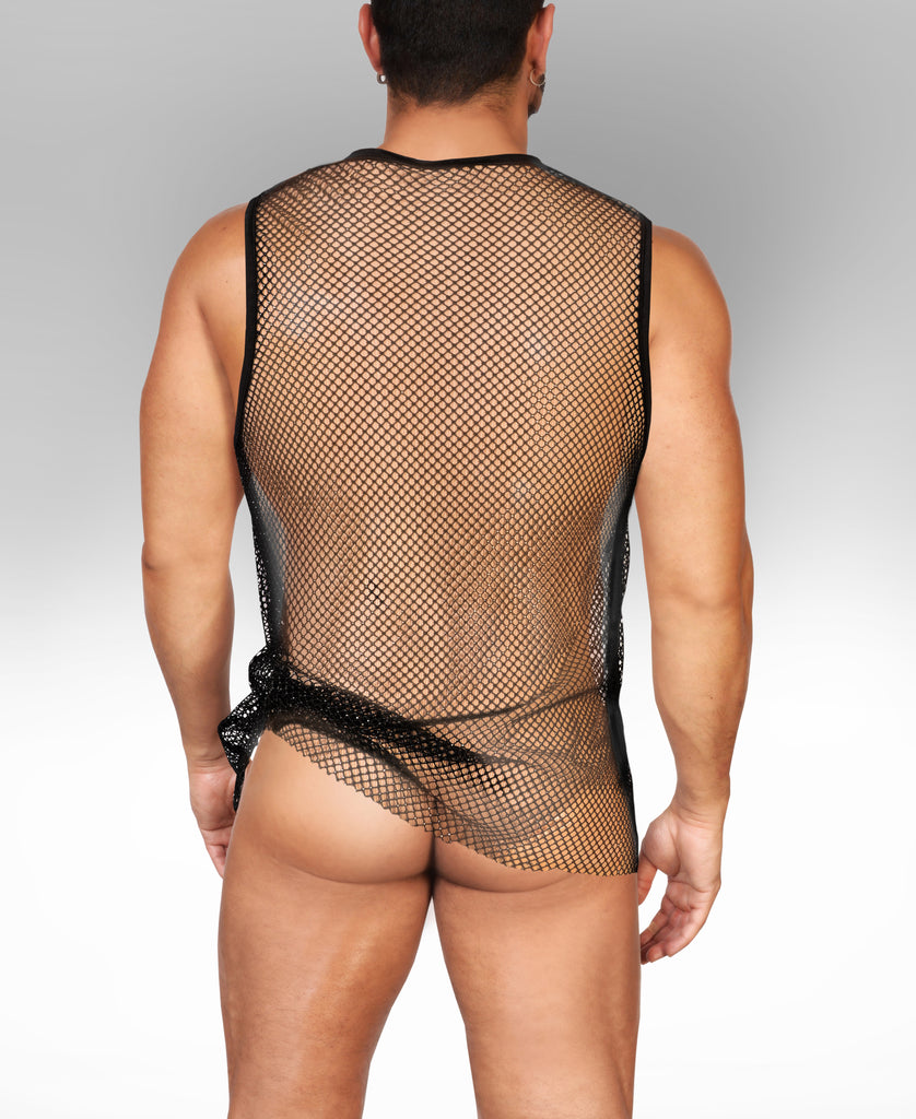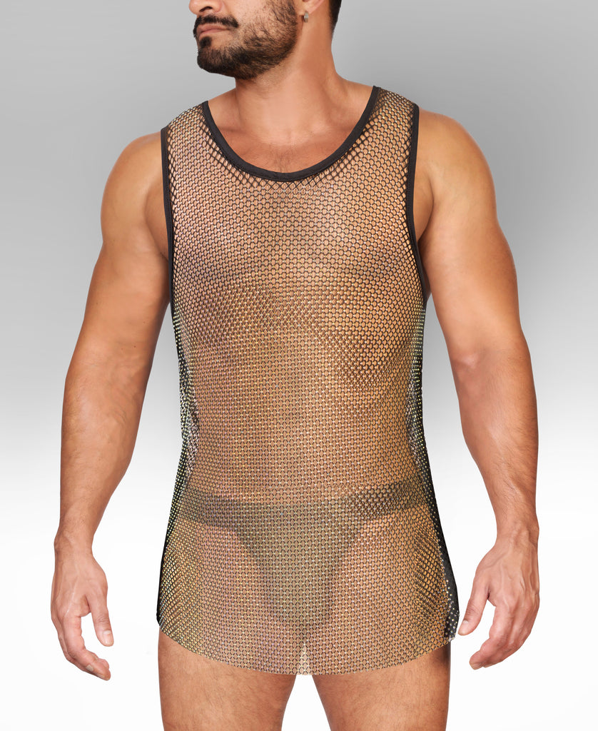 Own every flash of light. The Alpha Charlie Diamond Mesh Tank Top is crafted from black-on-black stretch mesh accented with diamond-pattern sequins and Aurora Stones that shift colour as you move — catching every spotlight and every stare. Lightweight, breathable, and flexible, this see-through mesh tank delivers bold energy that’s made to shine long after the lights go down.