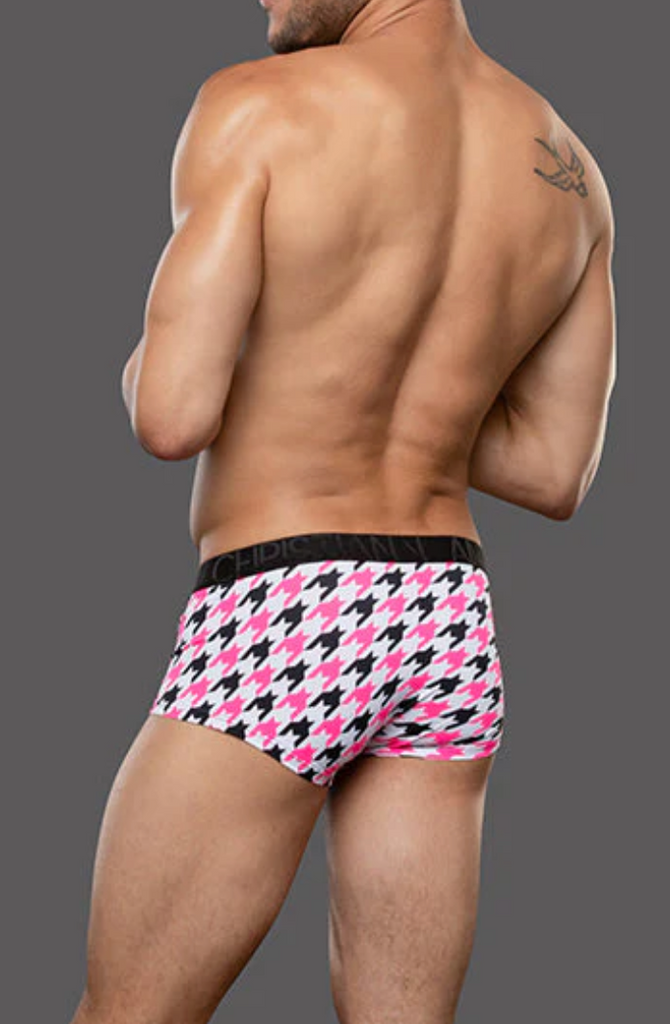 Who says classic can’t be a little kinky? The Houndstooth Boxer underwear takes that timeless print and turns up the volume with bold pops of pink and a sleek black waistband. It’s fashion-forward, unapologetically queer, and ready to make a statement whether you’re on the runway or in the sheets. Give them something to bark about. And with the help of our slimming waistband and built-in ALMOST NAKED® pouch, you’ll feel like you’re not wearing anything at all! We’ve virtually eliminated sticking, squashing, re-adjusting, sweating, or chafing. Your package will fall naturally into the anatomically correct pouch to create a truly enjoyable and unique wearing experience.