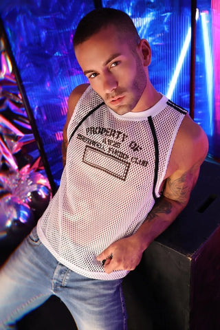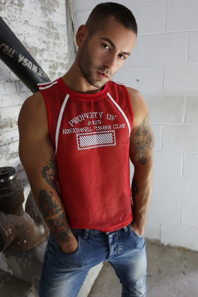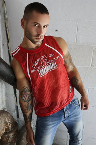 Our Gymnetixxx Jersey is one of our most versatile tops (and we know how rare those are). With its square, short, boxy cut, it’s perfect as is or as a cover-up for the Gymnetixxx Body Harness. In red or white, the JERSEY is made of an open hole mesh so it breathes whether you’re sweaty from pumping iron or working your wood. The vintage, athletic print on the front reads “Property of” and “Breedwell Fuck Boi Club,” which complements the sporty bindings and racer-style PVC logo.