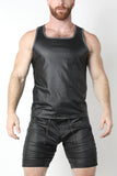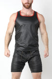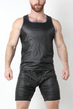 Unleash bold energy with the ANTI CHROME Tank Top, crafted from a premium stretchy vegan leather blend (67% Polyester, 25% PU, 8% Spandex) for a sleek, edgy look that’s perfect for turning heads. Featuring colored racing stripes on the sides, and trim, this tank top brings attitude and versatility to your wardrobe. The seductive matte finish delivers bold appeal—less shiny than the Black Chrome collection but equally alluring. Pair it with matching ANTI CHROME Shorts for a standout outfit ideal for the leather bar or your next event.