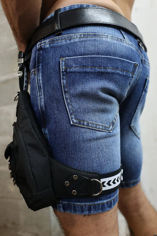 Our HUSTLER LEG BAG is a must-have accessory for club-goers. By the time you’re down to your JOCK, the last thing you want in your hand is a wallet, phone, and bumper (what you want in your greasy paws is his rock hard 🍆). The HUSTLER BAG attaches to your belt or jockstrap waistband, rests securely on your thigh (it won’t shake off when your twerking), and features easily accessible front and interior zip pockets for all your personal items (the ones allowed in the club, and the ones that require a little more discretion, ahem). So, while you’re dancing the night away knowing that your ID isn’t on the floor of the back room, you can use your hands to caress the pecs of the trick in front of you.
