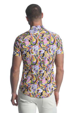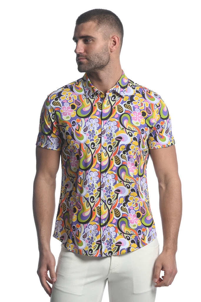 Printed short sleeve knit shirt featuring a spread collar, front button placket, a curved hem, and cut slim on the shoulders, chest, and biceps with back darts to create a pronounced taper at the waist. Made from a super soft premium 100% cotton knit jersey fabric with a natural stretch for maximum comfort. All-over periwinkle and green groove print pattern.