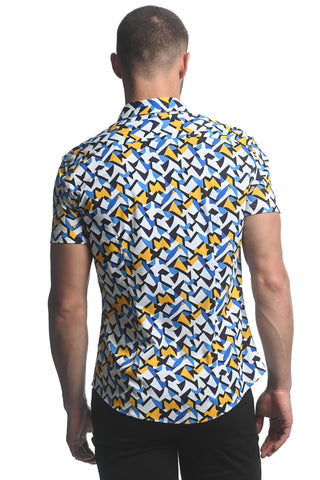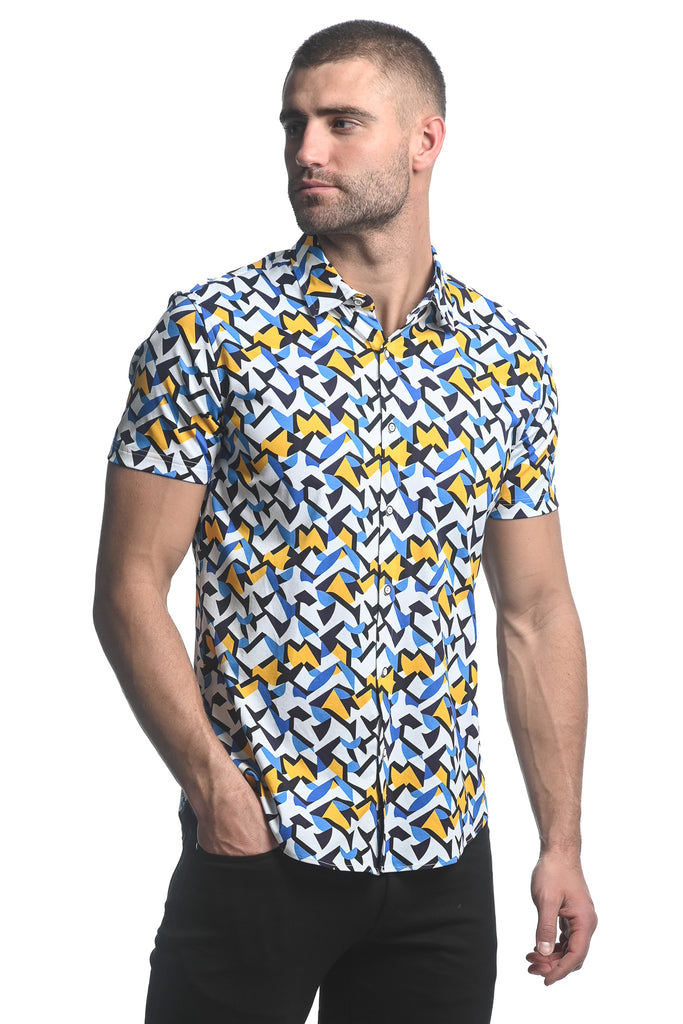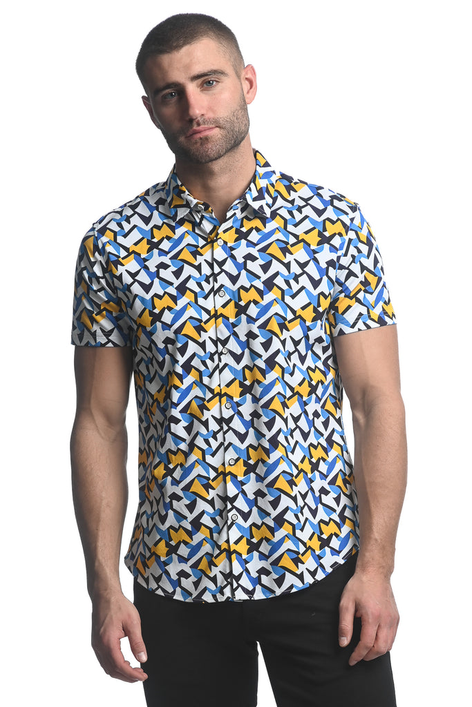 Printed short sleeve knit shirt featuring a spread collar, front button placket, a curved hem, and cut slim on the shoulders, chest, and biceps with back darts to create a pronounced taper at the waist. Made from a super soft premium 100% cotton knit jersey fabric with a natural stretch for maximum comfort. All-over royal and yellow abstract print pattern on a white background.