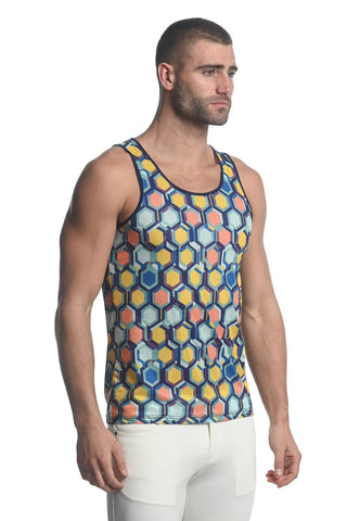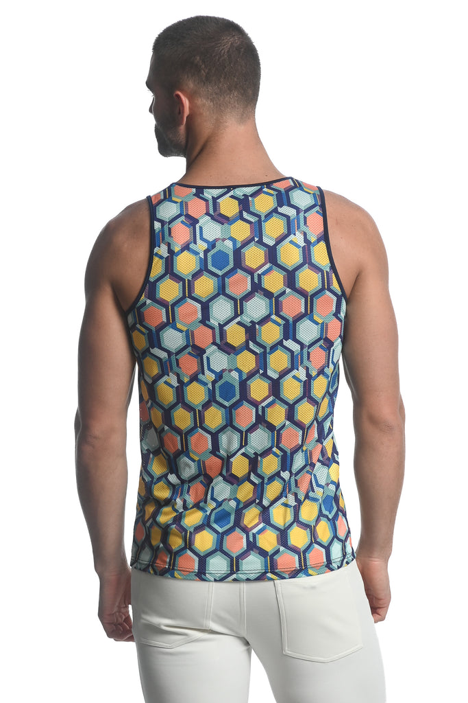 Printed stretch mesh tank with a slightly tapered fit. Featuring a scoop neck, a sleeveless design, a straight hem and contrast binding. Comes in an ultra-soft, moisture wicking, 4-way stretch, breathable mesh for added comfort. All-over, navy and yellow honeycomb print on a navy background.