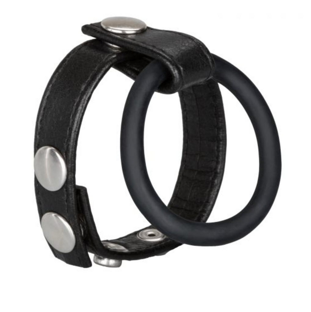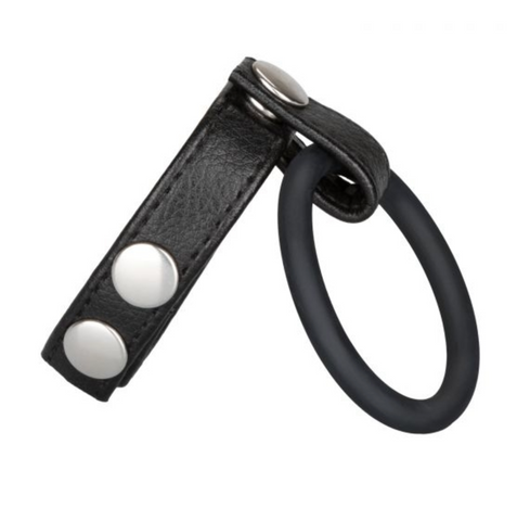Adjustable erection strap and ring combination that provides for prolonged erection and more enjoyable love-making. The leather strap with three silver-toned snaps allows quick and easy adjustments. The rubber cock ring is designed to maintain the ultimate erection.