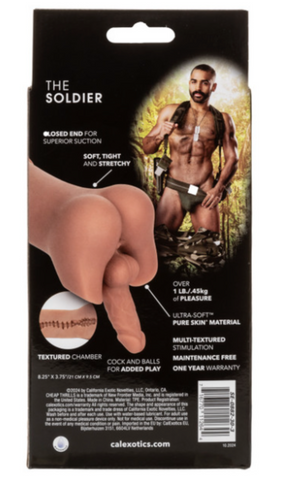 Fall in line for an unforgettable experience with Cheap Thrills The Soldier, your dutiful companion in the quest for peak pleasure. Crafted from ultra life-like Pure Skin material, this masturbator weighs over 1 lb./.45 kg and is designed to mimic the feel of real skin, featuring detailed balls and penis for a truly authentic encounter.The Cheap Thrills The Soldier offers a soft, tight, and stretchy embrace, enhancing every movement with its intricately textured chamber. This design maximizes sensation with each stroke, while the closed end boosts suction to exceptional levels, mimicking the most intense experiences. Durable and maintenance-free, this masturbator is always ready for action and offers complete satisfaction without the fuss. Prepare for a powerful release with the Cheap Thrills The Soldier, where every session ends in victory.