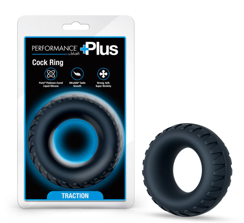 Maximize and boost pleasure with Performance® Plus Traction! This premium cock ring is built to intensify sensation, strengthen stamina, and support firmer erections with every use. Traction features an ultra-thick design and textured grooves that enhance stimulation and deliver a bold, defined look. Whether worn as a shaft ring or ball stretcher, it’s built to elevate your experience. Made from Purio® platinum-cured liquid silicone and wrapped in an UltraSilk® satin smooth finish, the ring is strong, soft, and super stretchy for a secure, comfortable fit. It adapts to most sizes while offering firm, focused support. Whether you’re building endurance or adding extra sensation to your routine, Traction helps you hold tight and go further.