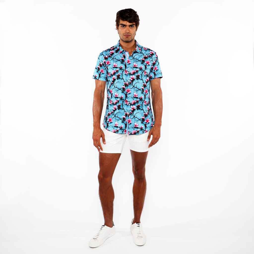 Crafted from soft cotton jersey, the bright teal background is layered with cherry blossom motifs that create dimensional depth. Seamless print alignment across the placket ensures a continuous, refined presentation.