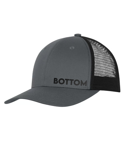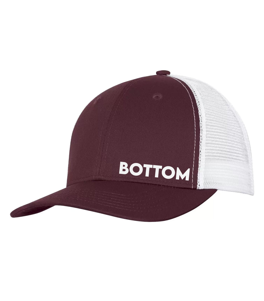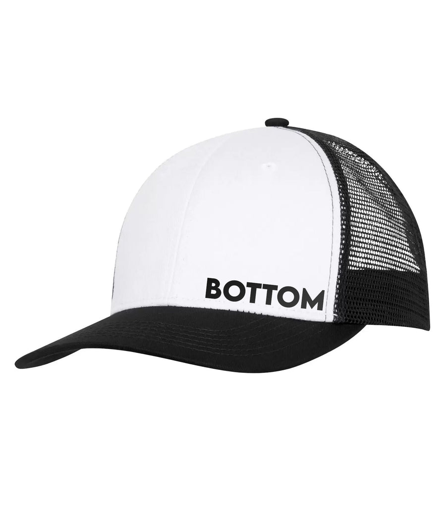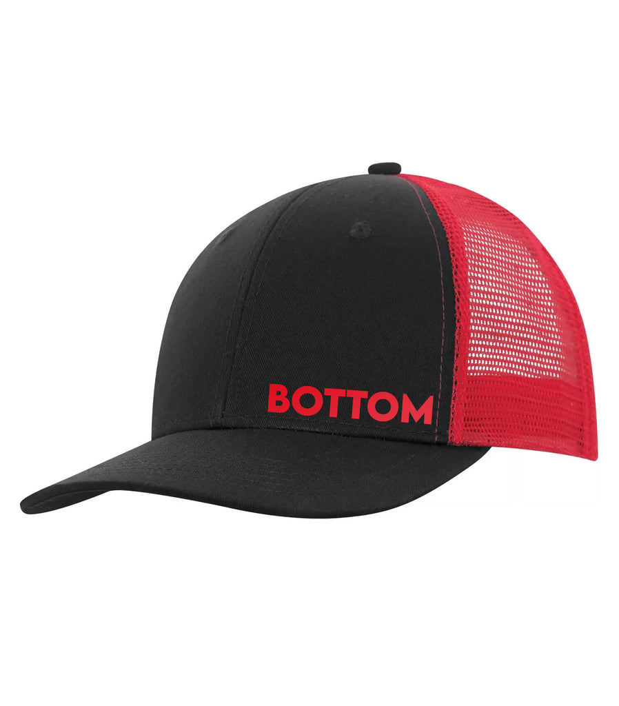 "BOTTOM" Decal on front left bottom in white on all colours except black on the White/Black and White/Navy. This cap is available for custom designs. Please contact us at outonthestreet@aol.com with requests.